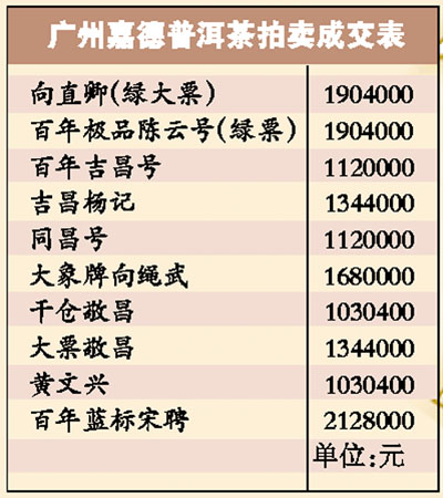 广州嘉德云南普洱茶专场中,10件拍品成交价超过100万元;