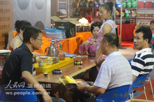 浙江温州茶博会现场,各地的茶品和紫砂茶具令前来参观的温州市民耳目一新、流连忘返,包括产自云南的云南普洱茶、安徽祁门的红茶、湖南的黑茶等。一位来自云南昆明的茶商边品着铁观音边称赞:“(品茶的)气氛很好,茶的品质也很好。”
