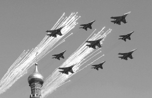 蓝天白云下,“俄罗斯勇士”和“雨燕”飞行表演队的25架战斗机组成数字“65”造型,宛如一枚醒目的银色徽章镶印在空中;6架战斗机尾部喷射的白、蓝、红三色烟雾组成俄罗斯国旗图案,好似一条彩带在红场上空随风摇曳……这一幅幅水彩般图画仿佛在提醒参加卫国战争胜利65周年庆典的观众们,卫国战争那段历史是俄罗斯和全世界人民永不褪色的记忆。