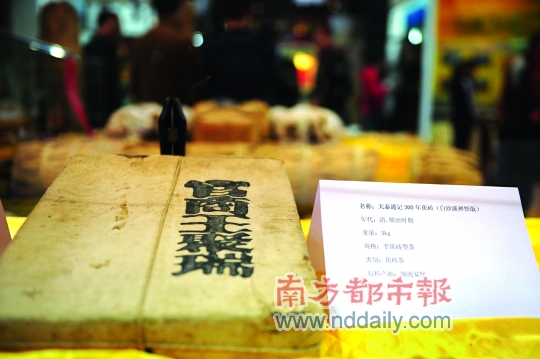 昨天中午,深圳会展中心茶博会上,一展位展出的300年历史的砖茶。