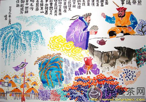 陕西是我国古老的茶文化发祥地之一,留下了许多珍贵文物与遗址,例如陕南汉中地区煎茶岭就是一例。三国时诸葛亮身居褒汉,志在伐魏,为团结一致共同抗敌,在勉县去略阳的一座山顶上设煮茶坊,亲派使者到接官亭邀请当时军力强大的驻宁羌兴州(今日陕西宁强县与四川广元市交界处)的羌氐族首领来上山品茶议事。诸葛亮谈茶论道,欲借谈茶性和中庸之道以谋求与羌氐和合携手共讨曹魏。羌首在宁静的品茶中得益,深受诸葛亮人品与才华的感化,亲帅数十万大军归汉共同北伐。为祝贺这一功事件,诸葛亮赐其山名为“煎茶岭”,延传至今,已成为诸葛亮以茶睦邻的古遗址。李运正在表现这一事件时,把羌族首领居右上位,而诸葛亮居左下位,强化了人物形象。体现出了客来奉茶的礼节性,乃是上坐、上坐、请上坐,喝茶、喝茶、喝好茶的诚心诚意。这样就把绵延起伏的山岭与三国古栈道上的刀光剑影般做了淡化般的处理,只有让人对茶中的和为贵有了深刻的理解。