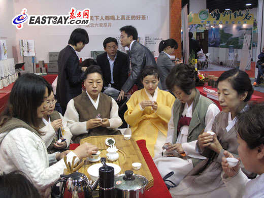 在上海国际农展中心内,东方网记者看到,本次上海茶业博览会共吸引了来自安徽、云南、四川、浙江、江苏、福建、湖南、江西、广东等10多个省市的200余家企业、茶产品600多种参展。与往年不同的是,除了能在现场购买到最正宗的新茶、好茶外,今年展会现场还新设了品茶区,邀市民尝鲜品茗,并举行茶乡旅游推介、茶具茶艺展示等系列活动。现场除了上海市民和茶叶爱好者,一些穿着韩国传统服饰来自韩国的客人也加入到了品茗的队伍。