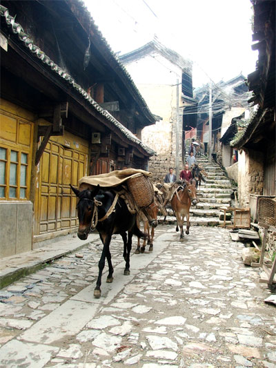 “半为山村半为市,可作农舍可作商。”小镇就这样年复一年地迎来送往着一队队马帮,茶马古道的繁忙亦月复一月维系着小镇勃勃的生机。如今,夜宿小镇,大清早你就会被相闻的鸡犬声催起。老街热闹起来,“吱呀”的开门声此起彼伏。生意人缓缓卸下那一块块高高的门板,伸个懒腰、打个呵欠后,在不远处油炸点心的青烟和香味中,琳琅满目的小商品摆放出来了。布匹、酱菜、铁锹、水瓢……早市的生意自然兴隆,老板笑呵呵忙活着,这是小镇一天的序曲。偶尔也能看见挂着铃铛的马匹,驮着柴禾煤炭从街中心穿过,重蹈着古巷石板路上岁月留下的马蹄印记。