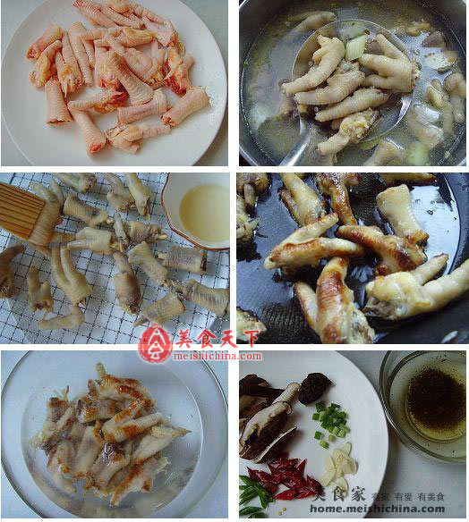 2、锅中水烧开,加葱段、姜片、料酒,放入鸡爪煮至断生;捞鸡放入流动水下冲洗,去浮沫、油。