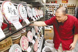 ▲為保護國內茶農,中國大陸茶葉目前僅開放“云南普洱茶”單項進口台灣,圖為台中某茶行老闆,整理架上的各種云南普洱茶。