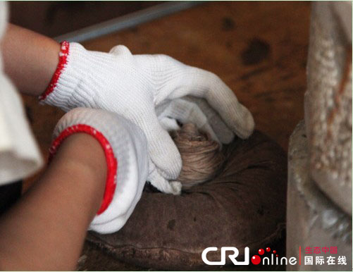 用石磨进行压制,为了能得到更紧密的茶饼,制茶师更是直接踩在了石磨上以增加重量。