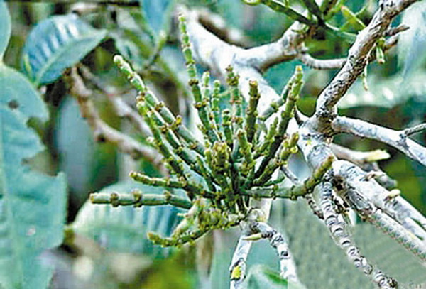 一位随我们一起去茶园的云南傣族女孩指著一株云南古茶树上一瓣与众不同的绿叶,告诉我:“这是螃蟹脚,很珍贵的。”请教了有识之士后,方明白:螃蟹脚是一种云南古茶树上的寄生植物,因其枝条为节状带毫类似蟹钳,故被当地人称为“螃蟹脚”。这也是云南景迈山古茶园古树茶独有的稀有产物,从前茶叶在交易时就以此证明茶产地。因这种螃蟹脚生长极为缓慢,加之过量采摘,野生螃蟹脚的数量已极为稀少。市场价格也是居高不下。螃蟹脚具有药用价值,被誉为“茶茸”。新鲜螃蟹脚外观为绿色,晒乾后转为棕黄色。冲泡出的汤色黄绿透亮,鲜时有浓郁的特殊清香,陈化后有较浓药香味儿。资料显示,螃蟹脚性寒凉,味微酸,饮后回甘爽甜,具有清热解毒、健胃消食之功效。常饮可防止血管硬化,消除疲劳,延年益寿。