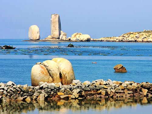 岛上的双帆石景点吸引了不少游人驻足,该景点位于平潭岛西北看澳村西侧500多米的海面,从远处就能看到一个圆盘状的大礁石,托着一高一低的两块碑形海蚀,整个礁石像一艘大船,两块巨石像两面鼓起的双帆,似乎正在乘风破浪,海中行进。从看澳村岸边坐渡船,十几分钟就能到达该景点。