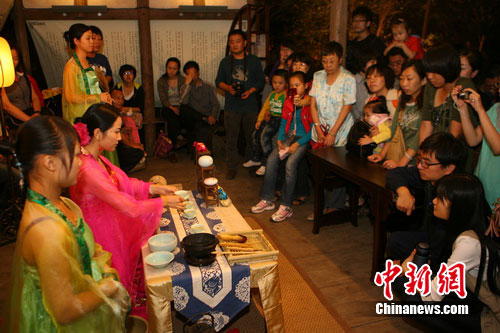 据茶艺表演的负责人介绍,自唐代开始,饮茶风尚流行全国,迎来了 “比屋皆饮”、 “投钱取饮”的饮茶的黄金时代,并出现了“茶圣”陆羽所著的世界上第一部茶学专著《茶经》。“开门七件事,柴米油盐酱醋茶”,茶叶成为我国各族人民生活中的必需品;“琴棋书画诗酒茶”,茶成为人们精神生活中的雅事,被誉为 “盛世之清尚”。唐代文人雅士深得茶之益处,清醒头脑,增长思维能力,易来灵感,于是争相沤歌茶事,开掘其文化内涵,创作了大量的以茶为题材的诗、文、字、画作品。诗圣杜甫也写有“落日平台上,春风啜茗时”的咏茶诗句。但是,茶圣陆羽对当时煮茶的具体过程却记载简约,致使唐代茶艺失传。今年,为再现唐代茶文化,成都杜甫草堂会同有关专家,经过挖掘整理古籍文献和反复实验,结合唐代的文化、民俗、服饰等元素,从茶叶的制作、茶具的制作搭配、水的选择,到茶艺表现手法,最后首次完成了唐代茶艺的重现,这就是今晚在夜游草堂活动中所看到的“唐风茶韵”表演。