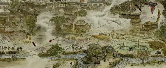 巍峨的云南普洱城墙之外,就是一派云南的自然风情。或浓或淡的南方热带雨林散落画卷,间有流水曲觞,赶着牛马了商队、放风筝的稚童、沐浴的少女……每一片叶子、每一颗果实都细细雕琢的树木在生动的人物的映衬下更具生命力和感染性,展现出一片不同于城内熙熙攘攘、繁华忙碌的悠闲自得的边城风光。