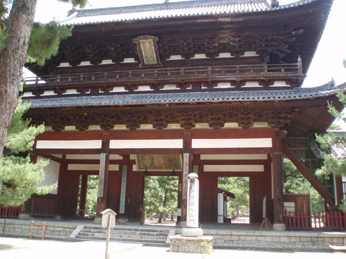 如今,我就站在这样一座寺院的总门前。总门其实并没有十分宏大的气势,只是像一个院落的大门,门前有两口井,曰龙目井。跨入门内,有一个售票处,门票五百日元。东侧有一个放生池,这也是日本的寺院所不多见的。拐一个弯往前走,巍然耸立着一座山门,纯粹的斗拱木建筑,上悬“万福寺”的匾额,为隐元所书写。门前种植了四株高大的松树,但应该不是当年所植,约有百来年的树龄,树干挺直而枝叶茂盛。山门外有一立石,上刻有“不许荤酒入山门”七个大字,不觉令我哑然失笑,因为如今的日本和尚,是既可娶妻,又可饮酒食肉,这是明治以后的新气象,而万福寺内,似乎依然严守着中国传来的“不饮酒、不邪淫”的戒律。