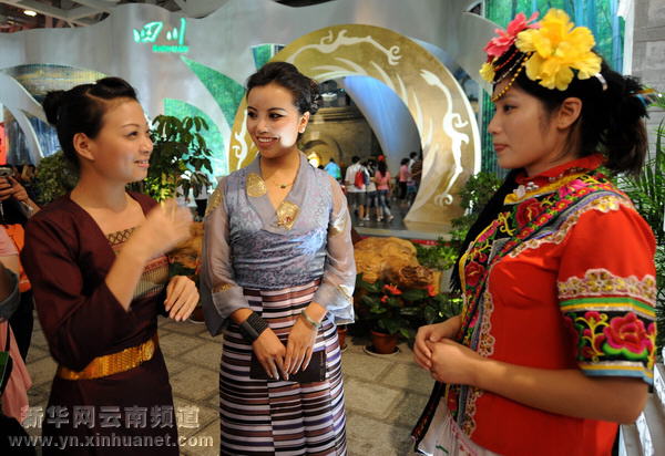 9月4日,格桑群宗(左)被云南馆演员华丽的服饰所吸引。