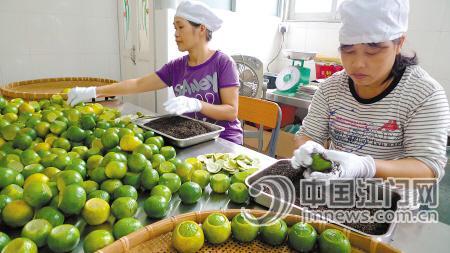 江门日报讯·挖空果肉、洗净果皮、装上云南普洱茶……二红柑开始收获了,昨天,新会区大泽镇五和村的大泽德丰茶叶加工场里,工人们正忙着用新鲜的新会柑制作新会柑普茶。