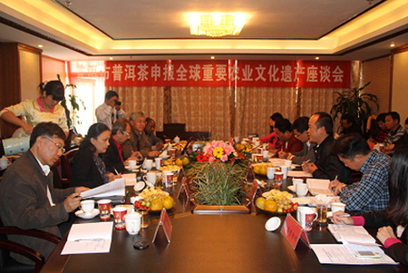 考察期间,还专门召开了“云南普洱市申报全球重要农业文化遗产座谈会”。童书玮以及云南普洱市委宣传部、市政府办公室和市发改委、农业局、规划局、民族宗教局、旅游局、茶叶局、国土资源局、文化局和镇沅、宁洱、澜沧、思茅四县(区)相关领导与工作人员参加了座谈会。座谈会上,云南普洱市农业局局长、市申遗领导小组云南普洱茶农业文化遗产申报办公室主任岩甾准备了书面发言材料,较为详细地介绍了云南普洱市审议准备情况;闵庆文研究员就云南普洱茶农业文化系统申报全球重要农业文化遗产文本编制情况进行了介绍。