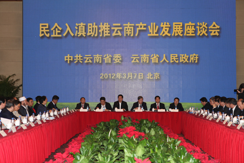 千龙网讯·三月的北京,春光明媚,万象更新。3月7日下午,北京新云南大厦高朋满座,欢声笑语。中共云南省委、省政府在京举行“民企入滇助推云南产业发展座谈会”。 邀请全国近200家民营企业家及出席全国两会的云南代表和驻滇全国政协委员、企业家代表出席座谈会。积极参与云南的“科学发展、和谐发展、跨越发展”以及桥头堡建设,共同谱写情系彩云南、携手创辉煌的美丽篇章。