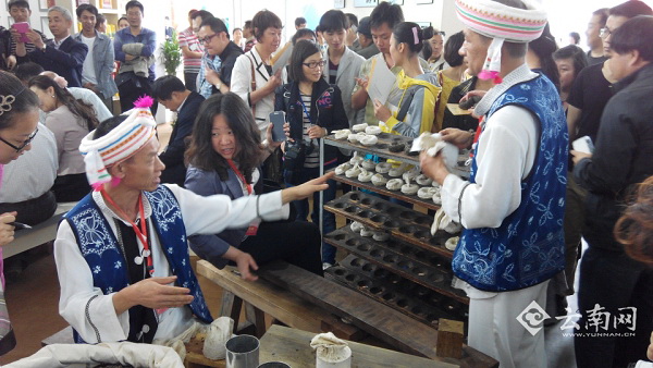 昆明国际会展中心7号馆内,云南普洱茶集团、云南下关沱茶、云南德风茶业、云南滇红集团、云南大益茶业等云南知名茶企正用各自的绝招招徕观众,云南下关沱茶甚至让市民亲自体会一把压制云南沱茶的乐趣,宾客轮流上场坐压模具,玩的不亦乐乎。