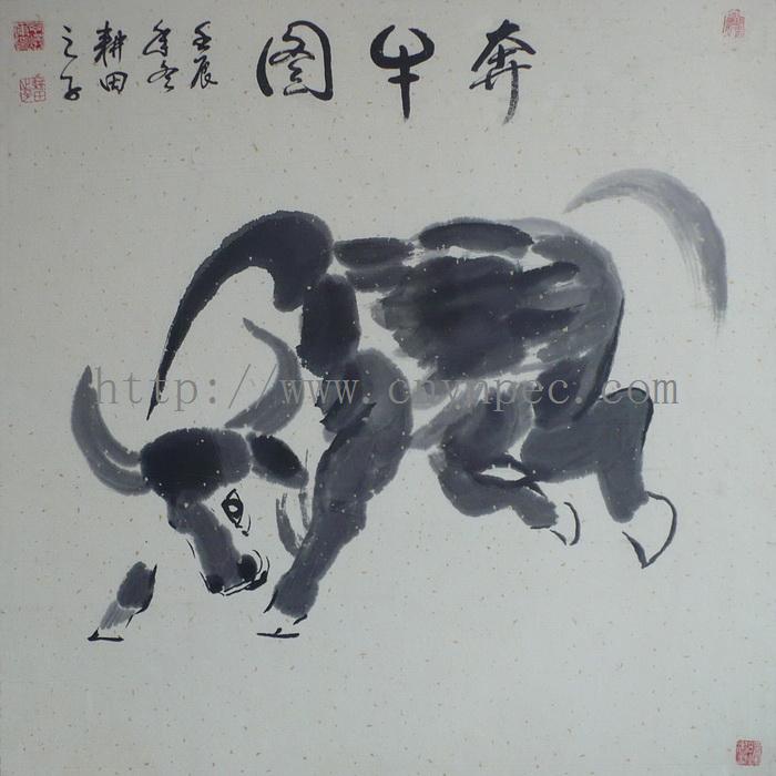 云南普洱茶信息网推荐·茶人书画家·耕田之子·丁焕东先生作品·奔牛图·中堂·