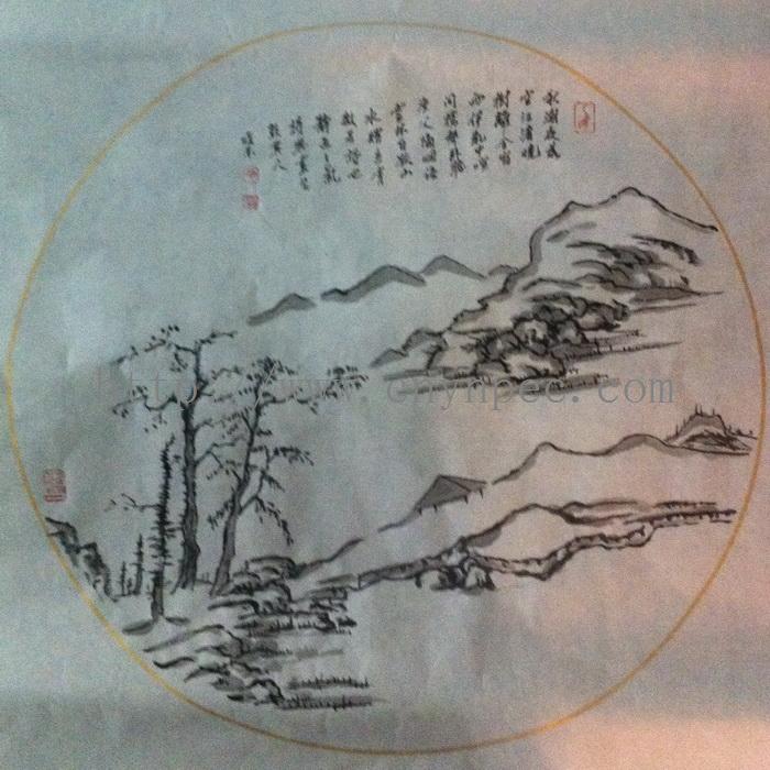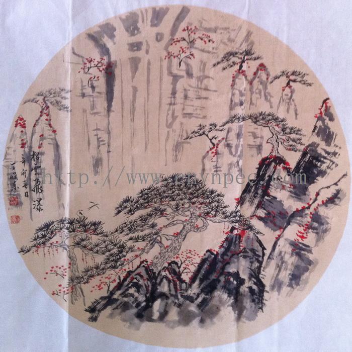 云南普洱茶信息网推荐·茶人书画家·耕田之子·丁焕东先生作品·山水图·圆形·斗方10