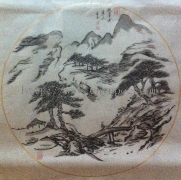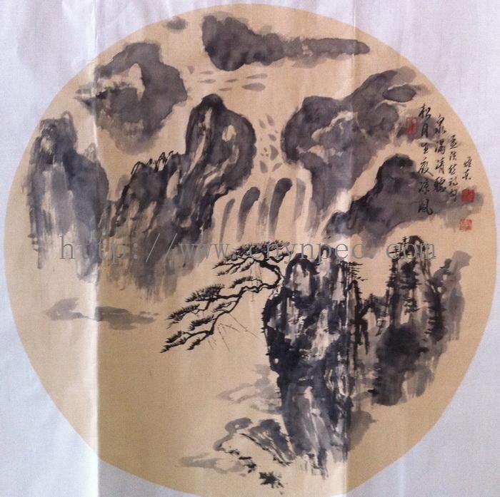 云南普洱茶信息网推荐·茶人书画家·耕田之子·丁焕东先生作品·山水图·圆形·斗方4