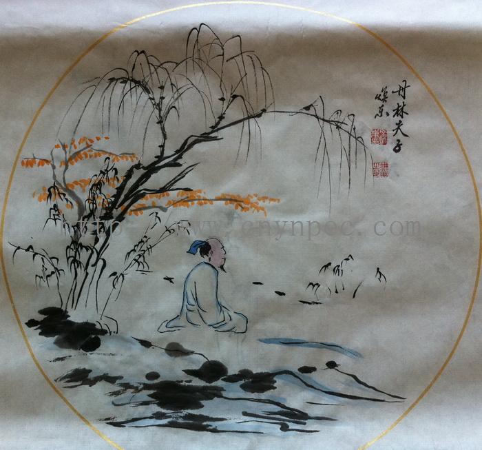 云南普洱茶信息网推荐·茶人书画家·耕田之子·丁焕东先生作品·山水图·圆形·斗方1