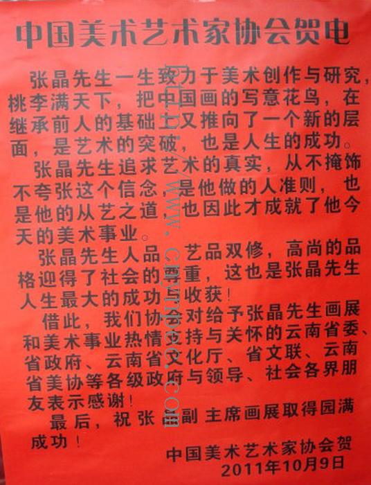 2013年由云南长城书画院主办·云南省残疾人联合会协办的“云南省首届文化助残大型优秀书画作品展”在云南省博物馆·隆重展出。云南长城书画院特聘书画家,中国著名大写意画家张晶先生书画作品,即:狂草书入画的中国画大写意作品“鸡图”,被特别推荐参展,并获得广大参展者和书画爱好者以及云南书画界业内专业人士、书画家、书画收藏家等的围观并一致好评且崇高赞誉。