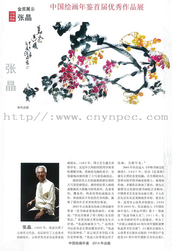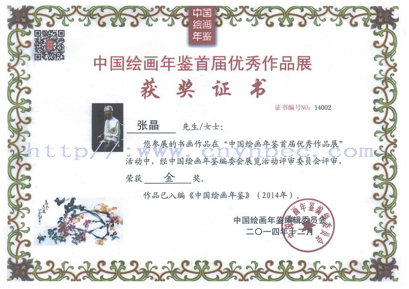2014年·由中华人民共和国新闻出版署获奖出版物·《中国知识资源总库》中国年鉴全文数据库(CYBD)·中国出版工作者协会年鉴委员会·中国年鉴资源全文数据库核心年鉴·主办且隆重出版《中国绘画年鉴》精装收藏版。并“《中国绘画年鉴》首届优秀绘画作品展暨优秀绘画作品获奖评选”在北京·隆重展出并由中国著名大写意画家张晶先生系列中国画大写意书画作品被永远收录入《中国绘画年鉴》且荣获金奖殊荣。