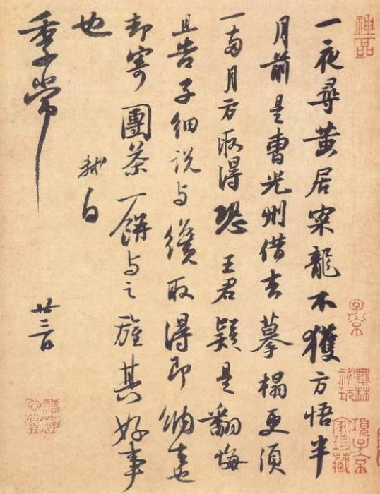 后来葬于吴县(今属江苏)渔洋湾董氏坟茔。清顺治元年(1644),南京南明福王政权以董其昌书画成就与元人赵孟俯相类,授予董其昌与赵孟俯相同的谥号“文敏”,后人因此把他称作“董文敏”。董其昌(15551636),明代画家、书法家。字玄宰,号思白、香光居士,华亭(今上海市松江县)人。官至南京礼部尚书,加太子太保致仕。绘画专善山水,师法董源、巨然、倪瓒等。讲究笔情墨韵,画格清润明秀。书法初学颜真卿,后转师晋、唐、宋诸名家,工楷、行、草书,自然秀雅。书画理论对后世极有影响,有《容台集》、《容台别集》、《画禅室随笔》等著作传世。其绘画多从古人画迹着手,通过悉心模仿和兼收并蓄地加以融会贯通,探求得古人的笔墨情趣。他擅长运墨,墨色鲜丽,层次分明,于意趣简淡中见天真秀润。