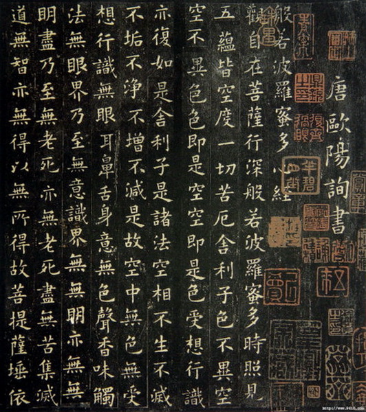 欧阳询所书碑刻传世的有:①《九成宫醴泉铭》。碑立于贞观六年(632),为他晚年奉敕书写。碑字高华庄重,法度森严,用笔刚劲,纤浓得中,寓险峭于平正之中,成为学习书法的楷模。②《皇甫诞碑》,立于贞观初年,笔画瘦硬,字呈长方,在结体取势中,充分发挥欧书的险峭的本色。③《化度寺邕禅师塔铭》,立于贞观五年,是欧阳询晚年得意的作品。字小于欧书其他碑石,书法静穆浑厚,严密秀腴,在精整险劲中别具风貌。原石早已损佚,在宋代就有许多翻刻本,敦煌莫高窟藏经洞发现的残本,亦有人认为是早期的翻刻本。④《虞恭公温彦博碑》,立于贞观十一年。这时欧阳询已80岁,但书法仍见功力。碑虽漫漶,从完好的字中仍可窥见谨严精劲的特点。欧阳询隶书碑刻有《宗圣观记碑》、《房彦谦碑》等。《房彦谦碑》书法介于隶楷之间,紧健峭厉,有晋碑的风貌,可见欧楷的渊源。相传欧阳询临有《兰亭序》,流传的定武本《兰亭序》,是根据欧临本上石的。传为欧阳询的小楷有《心经》、《九歌》、《千字文》等,但流传后世的拓本,真伪很难确定。◇代表作品◇卜商帖皇甫诞碑九成宫醴泉铭千字文虞恭公温彦博碑张翰帖九成宫醴泉铭