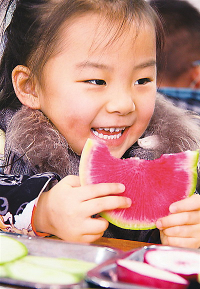 山东枣庄实验幼儿园的小朋友在吃生萝卜“咬春”。