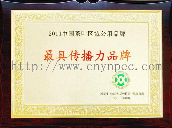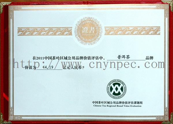 2011年4月11日, 由浙江大学CARD农业品牌研究中心、中国茶叶杂志和中国农业科学院茶叶研究所中国茶叶网联合组成的“中国茶叶区域公用品牌价值评估课题组”,在中国著名茶乡——浙江省新昌县的“中国茶市”,正式向公众发布了“2011中国茶叶区域公用品牌价值” 的评估结果。云南普洱茶获得了“2011中国茶叶区域公用品牌价值十强”和“2011中国茶叶区域公用品牌最具传播力品牌”两项大奖